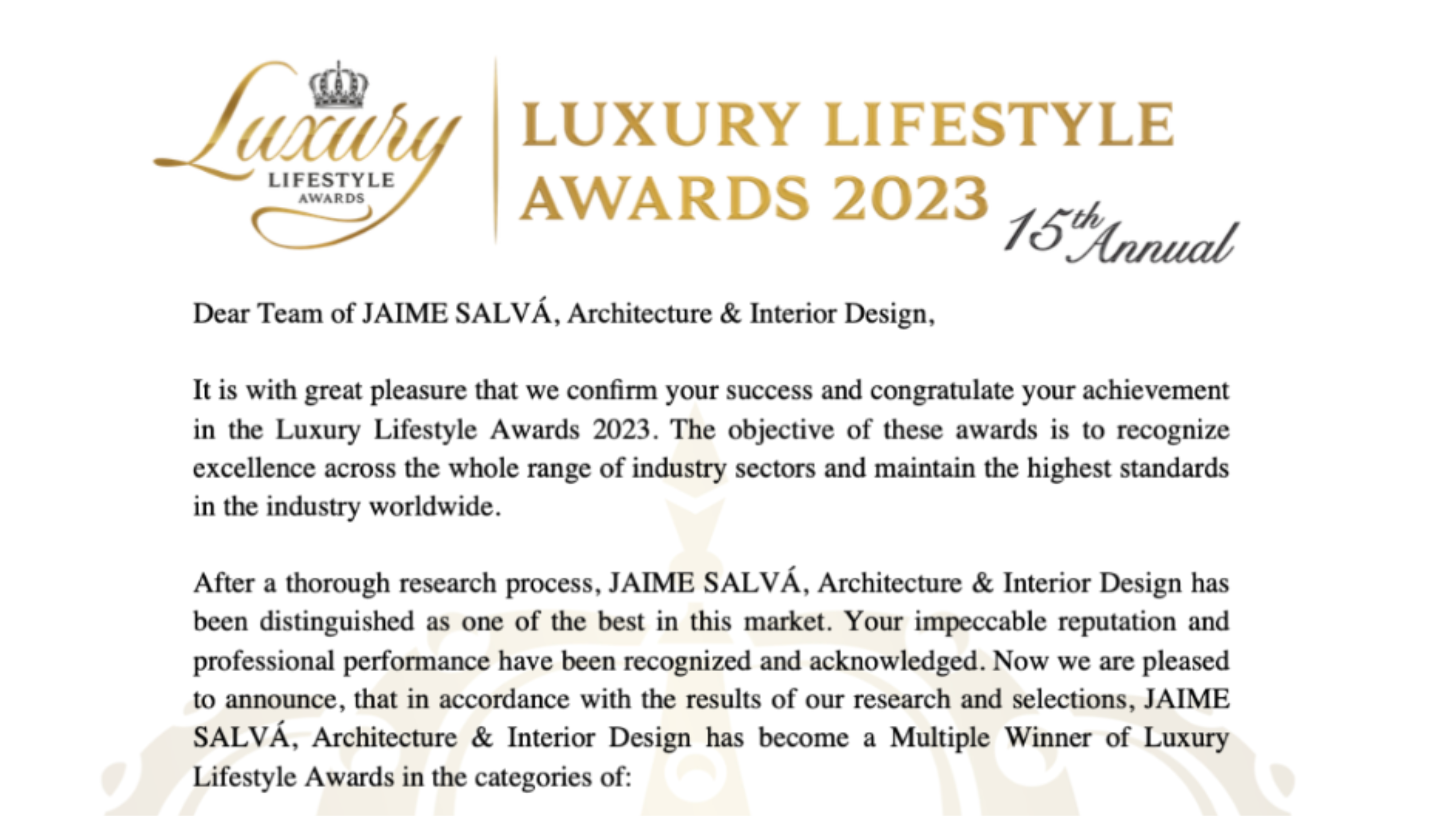 Estamos muy contentos de recibir una vez más el reconocimiento de los premios Luxury Lifestyle Awards, esta vez como ganadores.